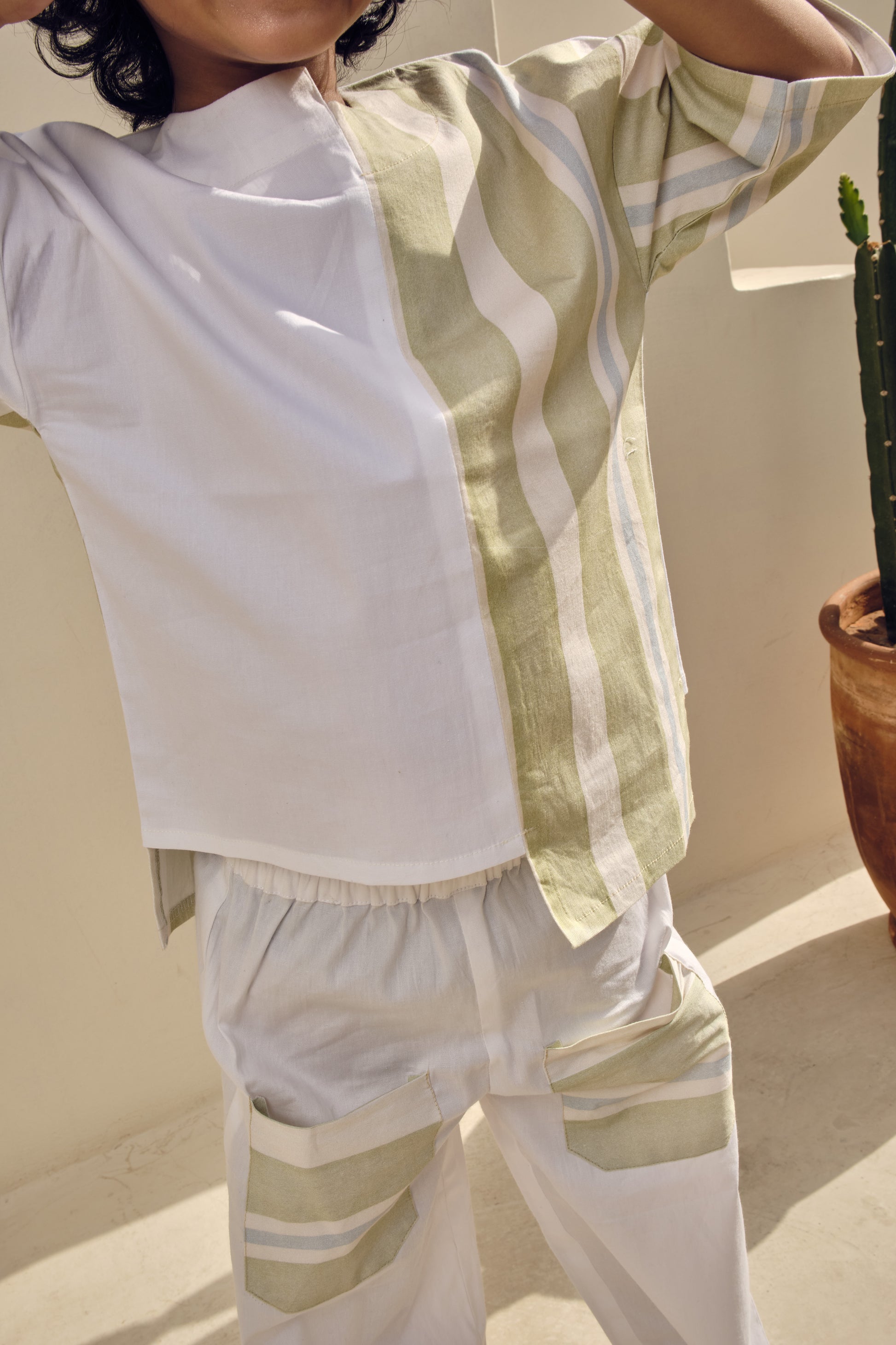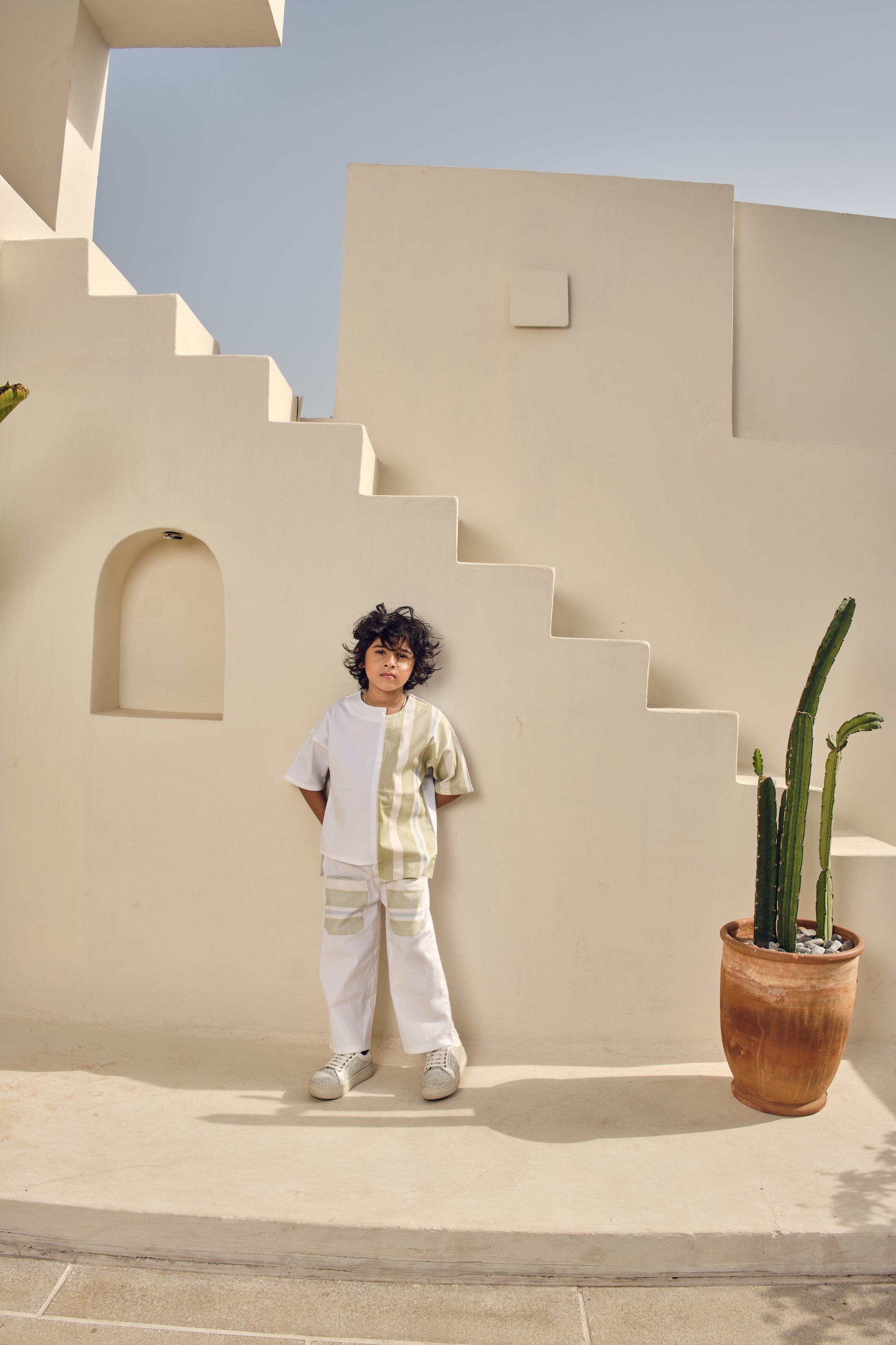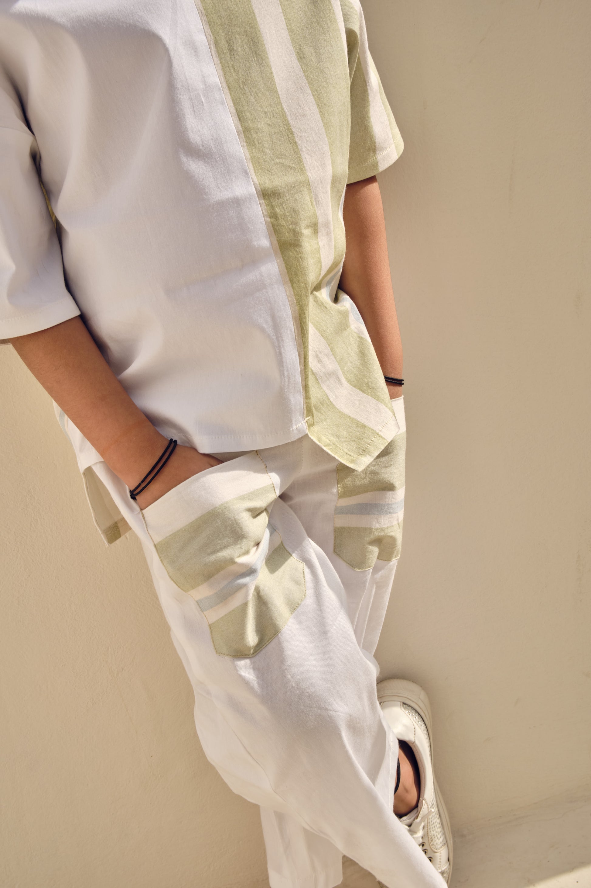 Made in airy cotton poplin, this two-piece set features a white T-shirt with muted olive stripe panelling and matching wide-fit