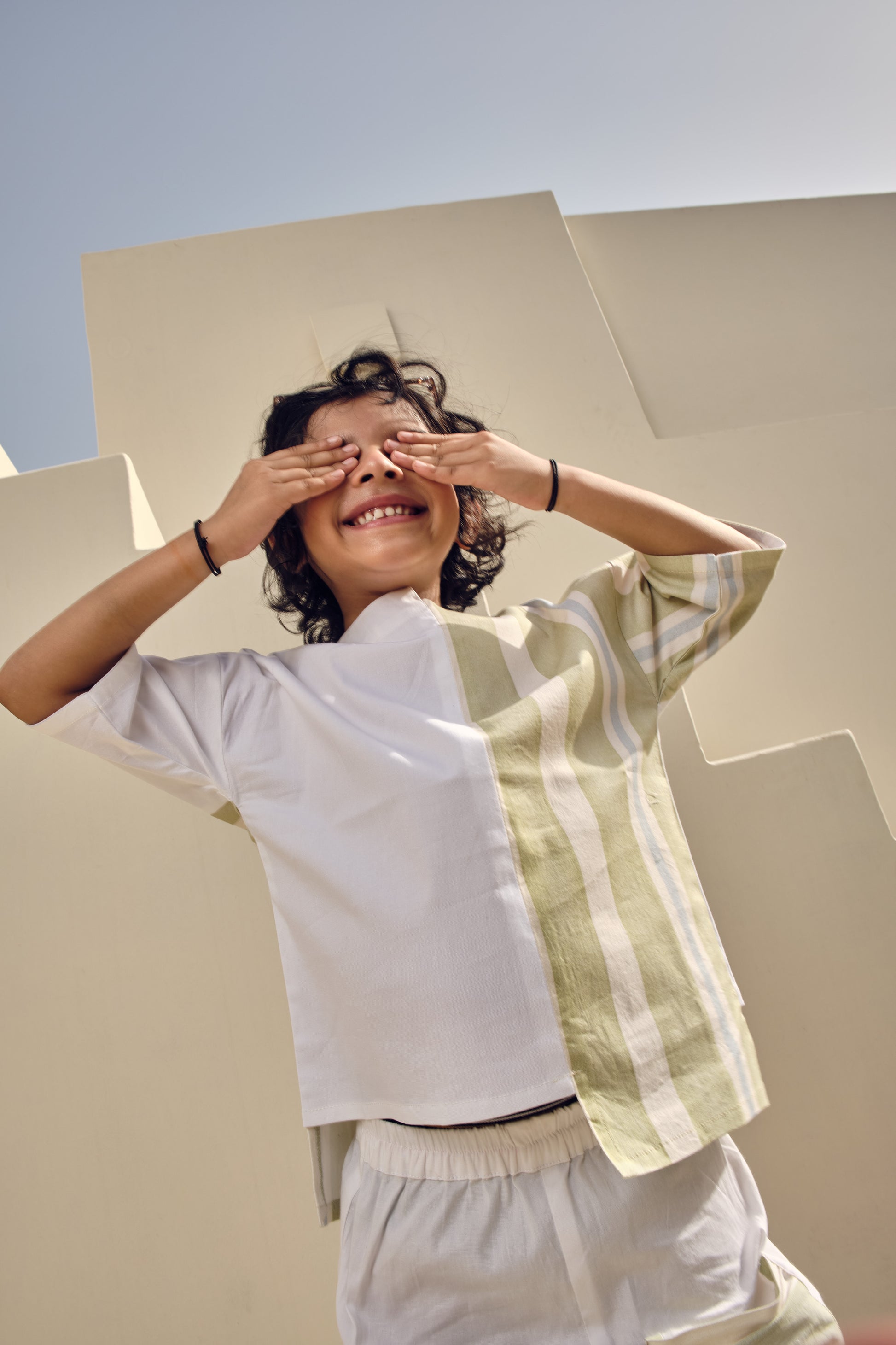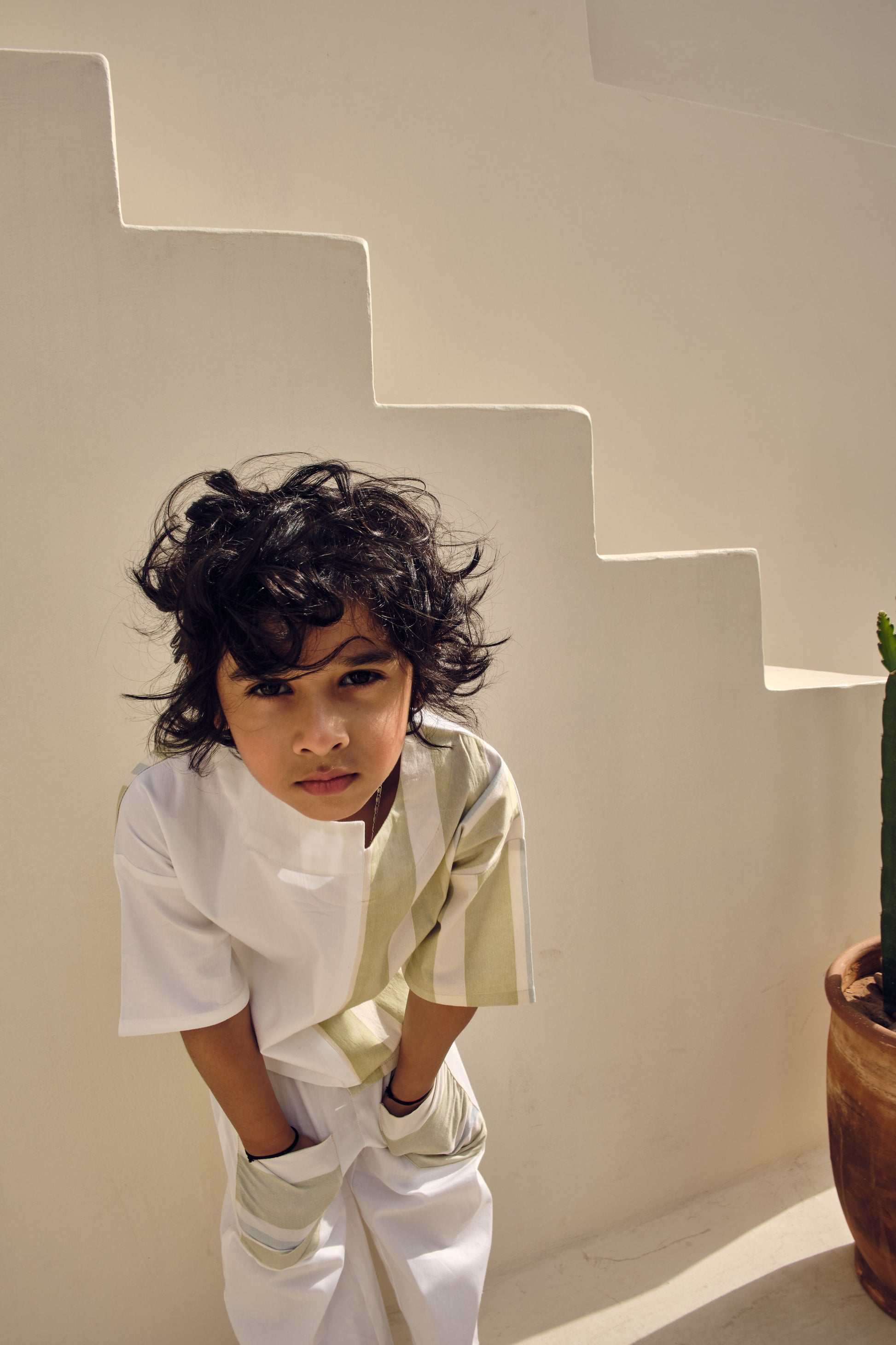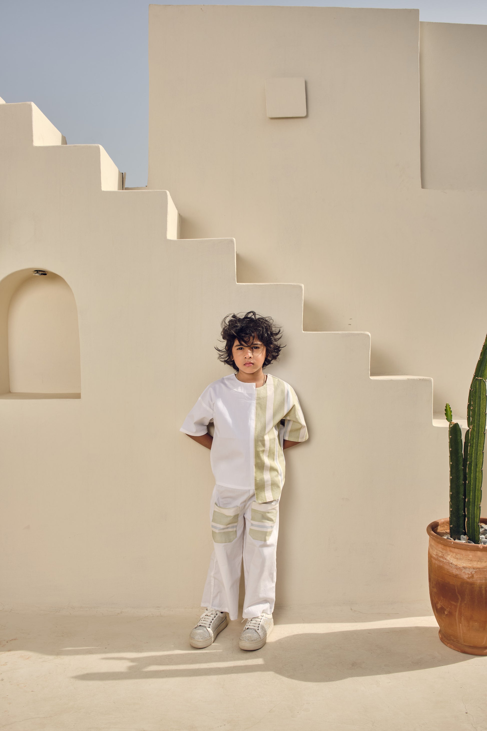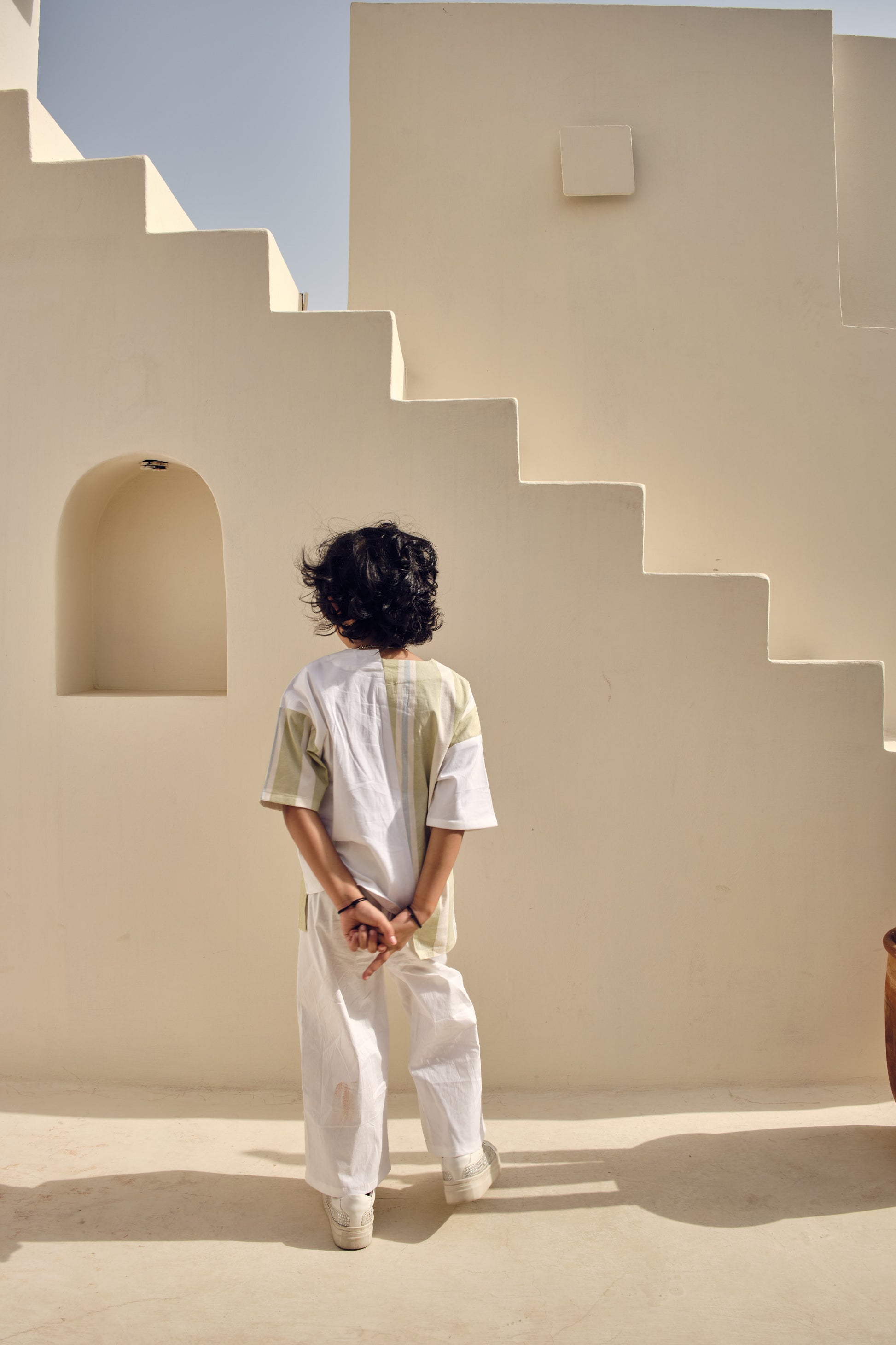 Made in airy cotton poplin, this two-piece set features a white T-shirt with muted olive stripe panelling and matching wide-fit