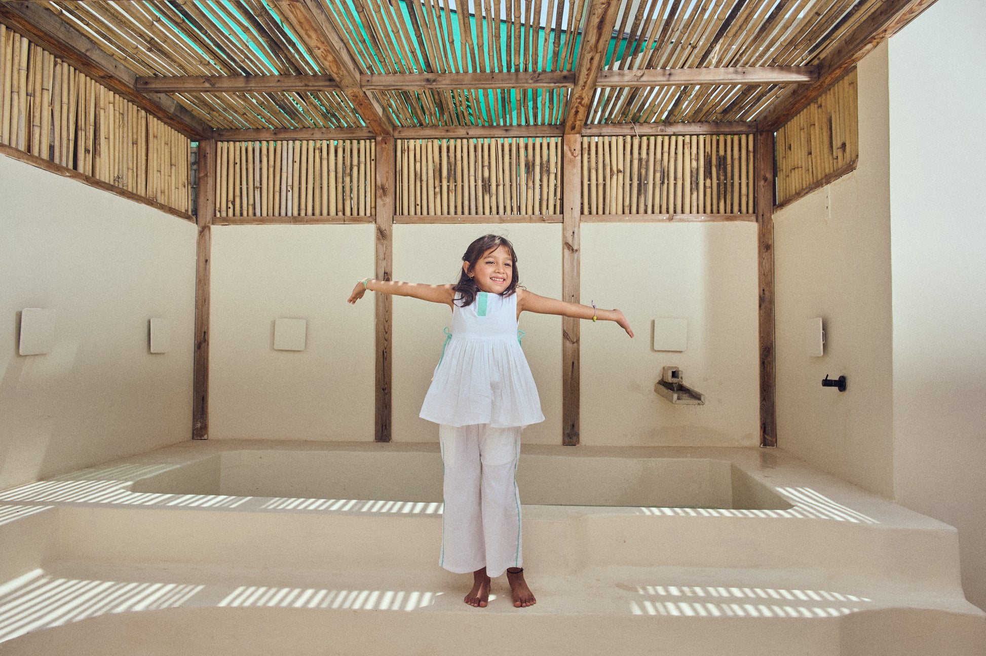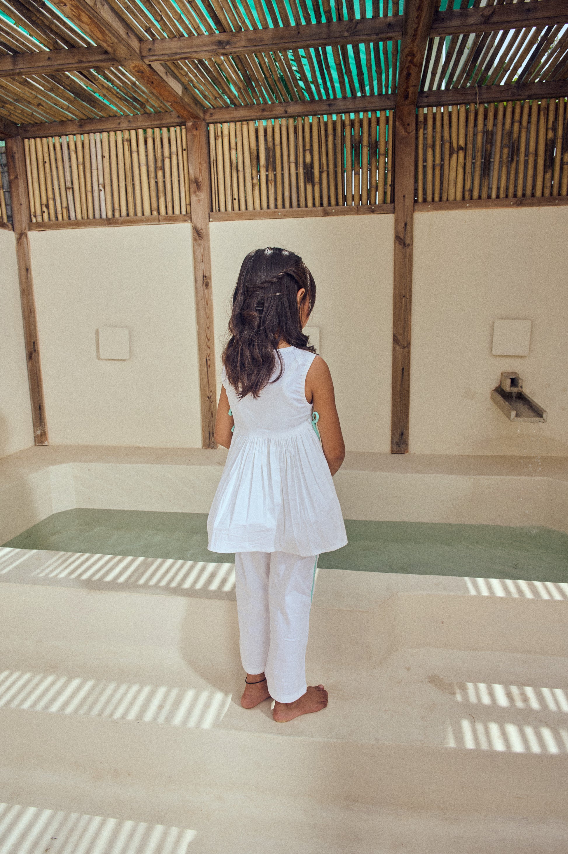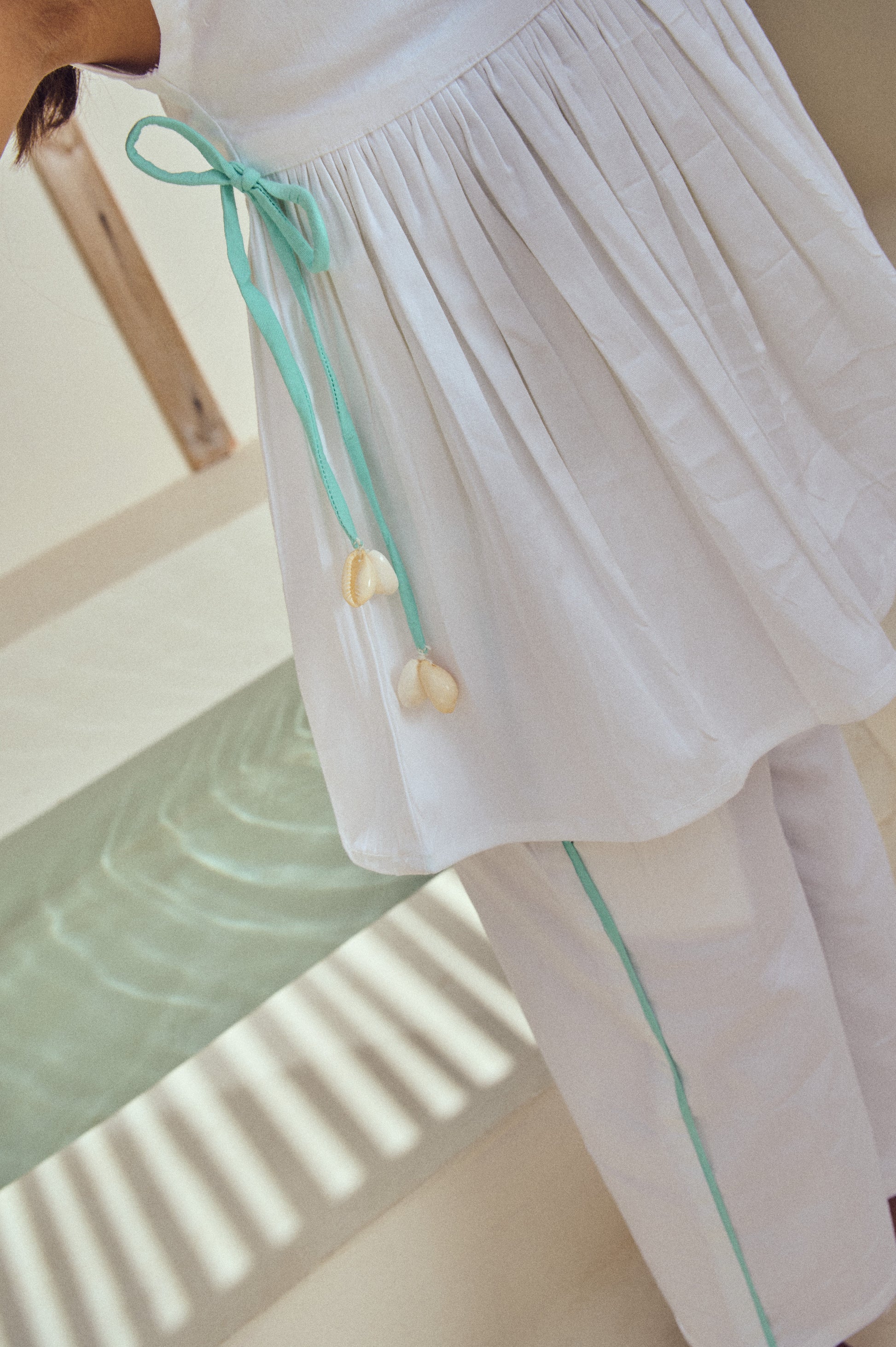 and fixed side ties finished with cowrie shell tassels. It’s paired with wide-leg pants featuring mint piping along the sides. Soft, easy,