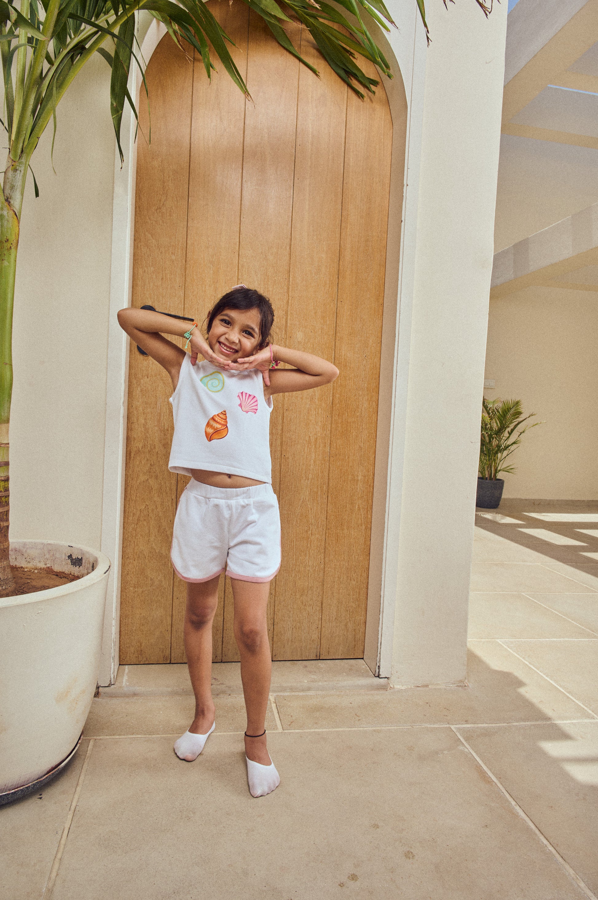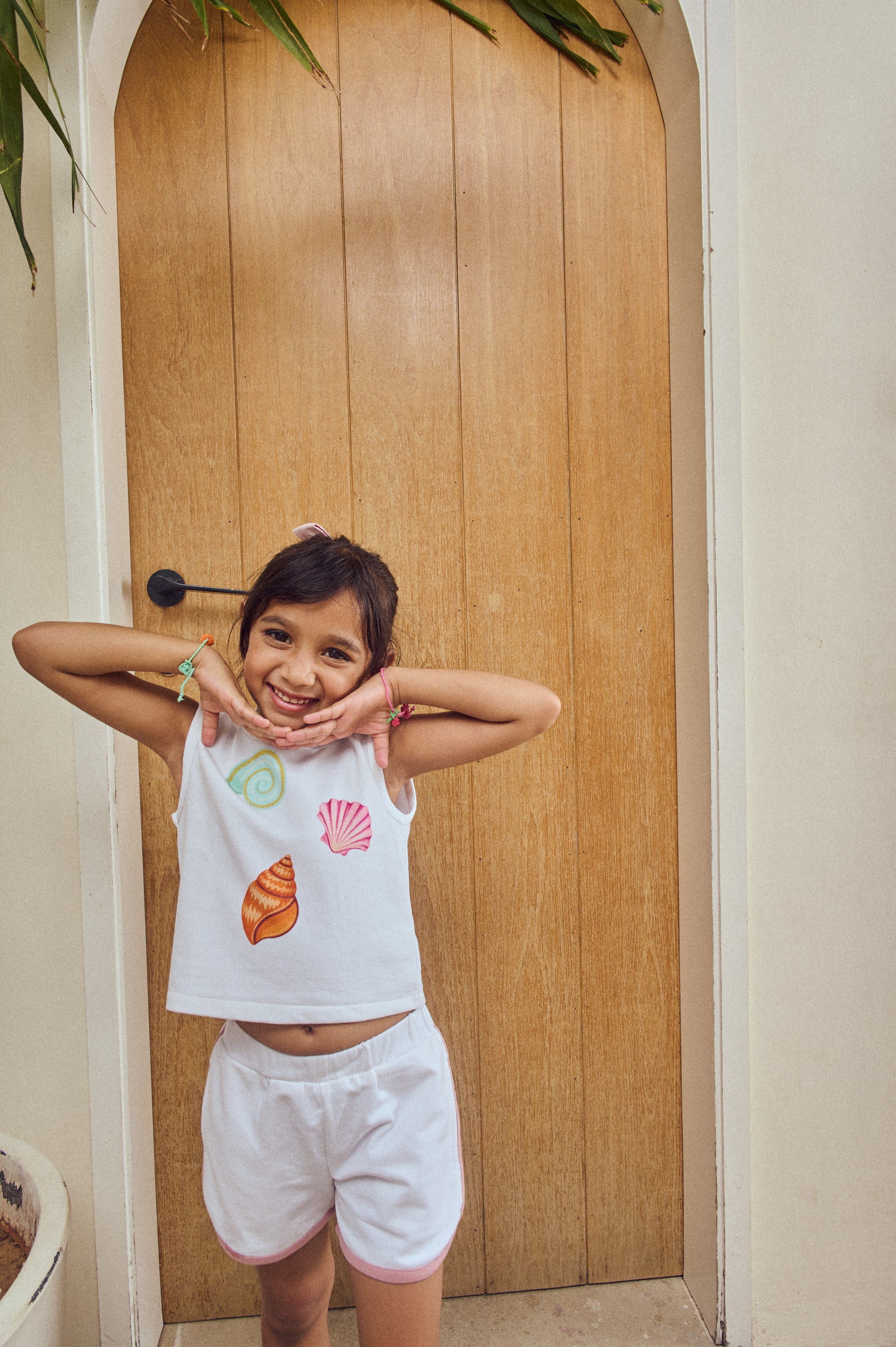 Printed with hand-drawn shells and soft coral motifs, set on a creamy white base in cozy terry cotton. The Shellie Set brings breezy